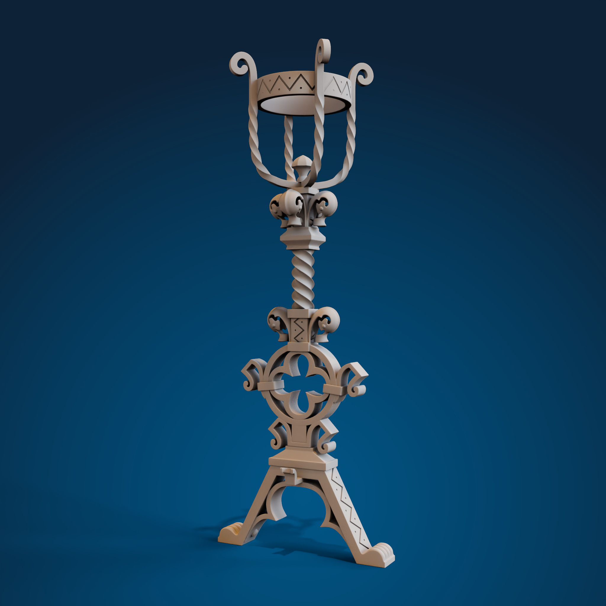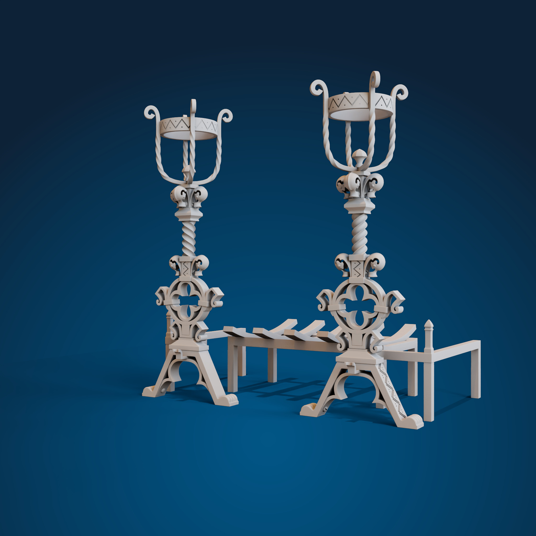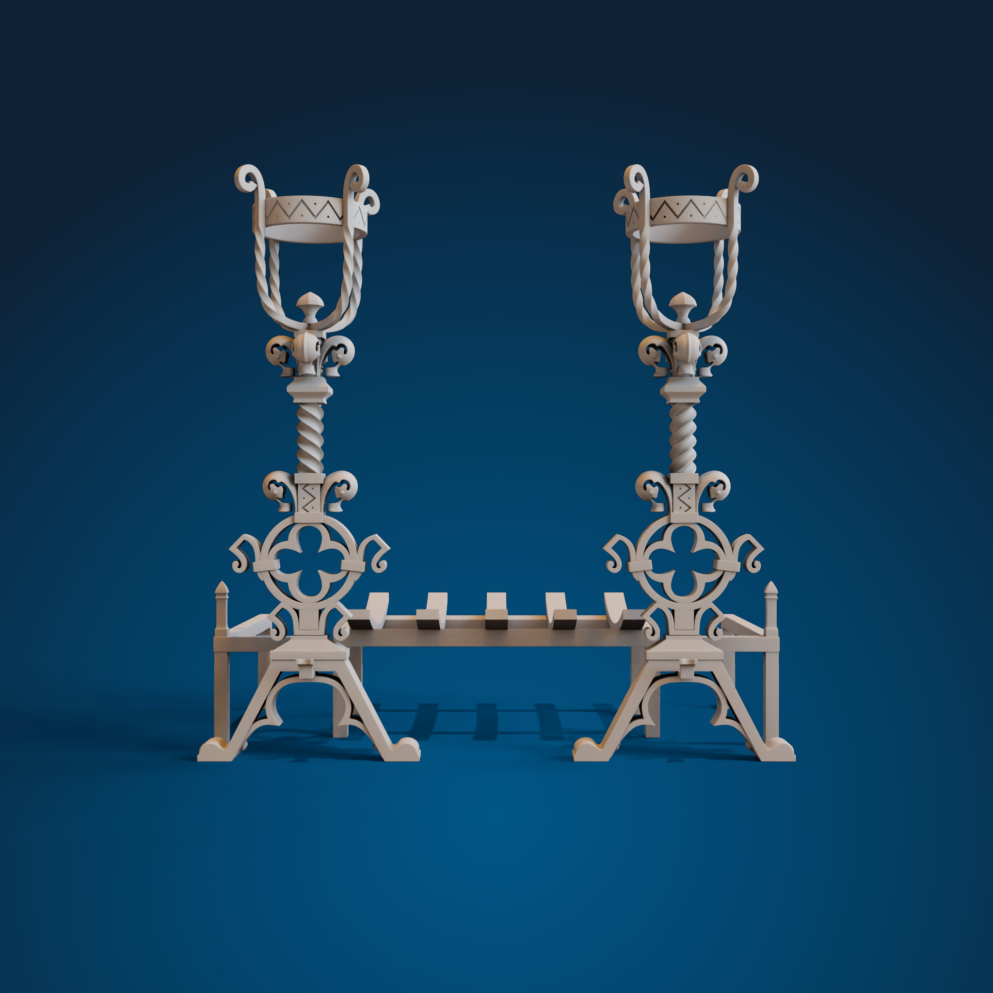 This custom fireplace andiron design is intended to be printed in either FDM or PLA as a 1/12 scale model for use in doll houses.